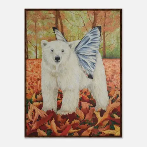 Cette oeuvre représente une tête de léopard et des ailes de papillon qui émergent d'une chrysalide de feuillages. L'association de la tête du léopard, gueule ouverte et des ailes délicates du papillon posées sur les feuilles d'un vert éclatant ajoute du mystère à l'harmonie des couleurs. C'est le symbolisme de la naissance et de la transformation qui est retranscrit à travers cette image.